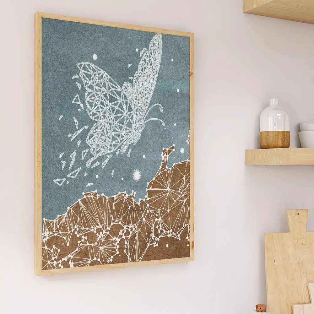 Un tablou abstract geometric floral emană energie și dinamism, atrăgând atenția printr-o explozie de forme și culori care se îmbină într-o armonie vizuală surprinzătoare.