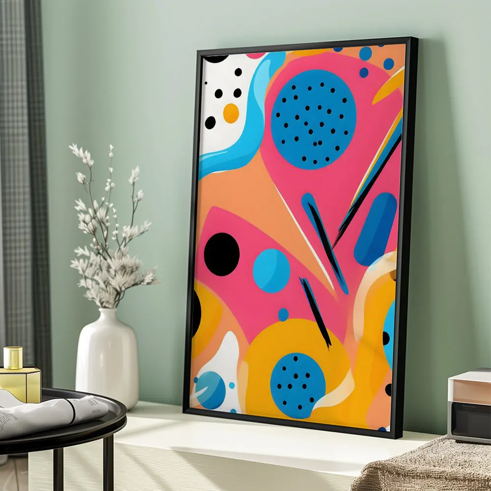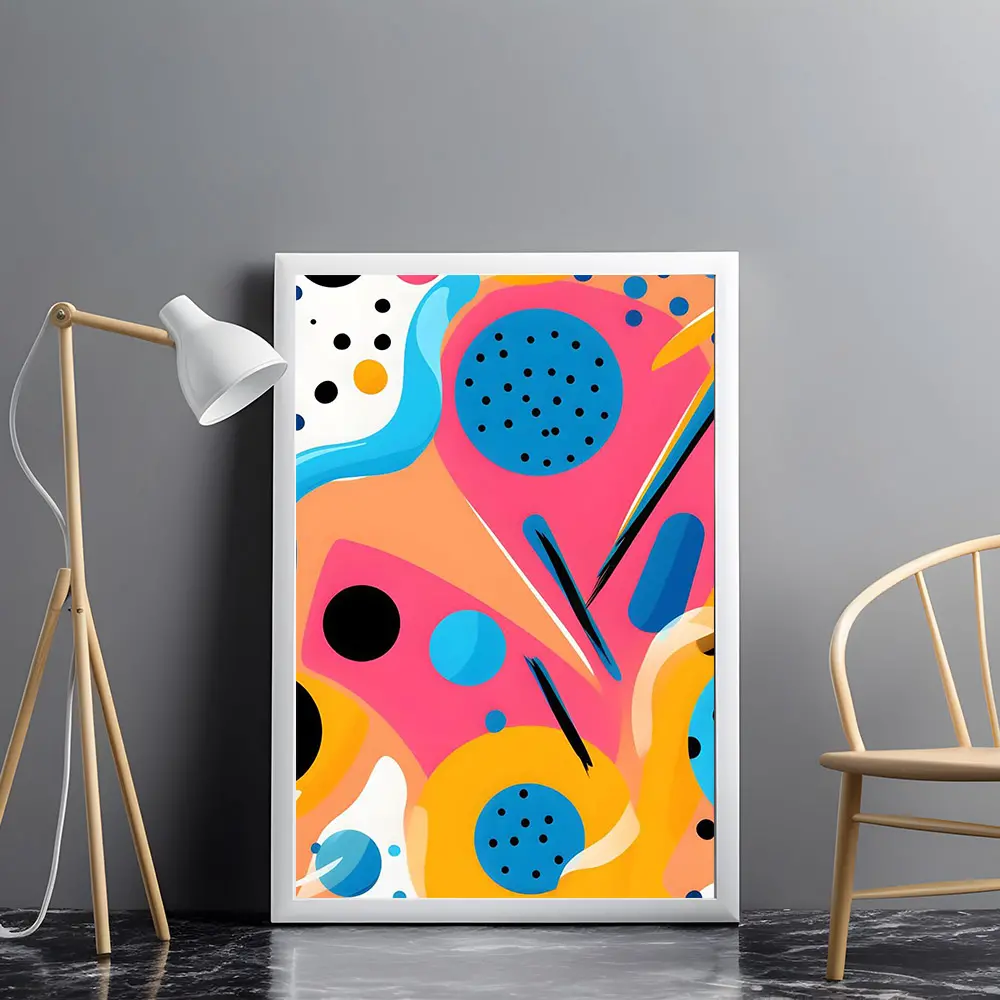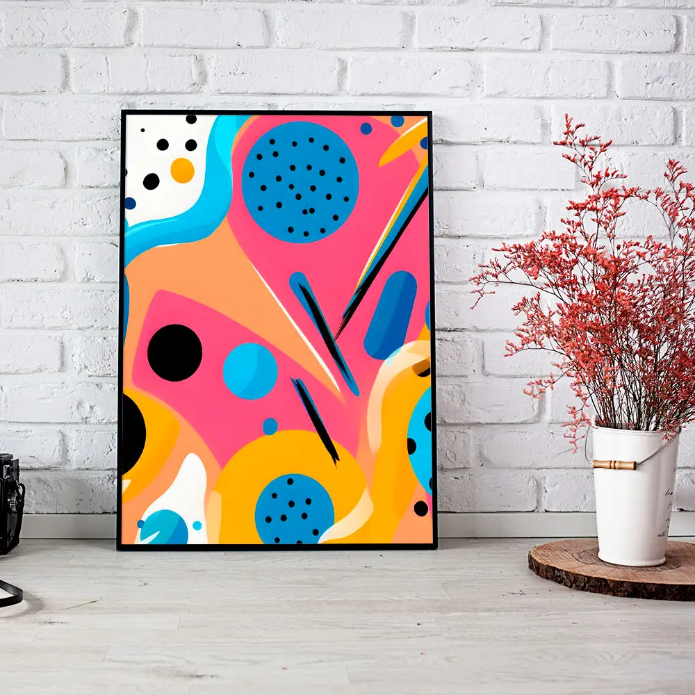 Un tablou abstract pop art emană energie și dinamism, atrăgând atenția printr-o explozie de forme și culori care se îmbină într-o armonie vizuală surprinzătoare.
