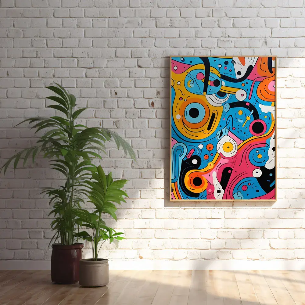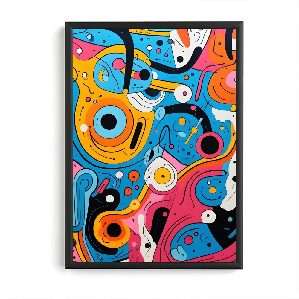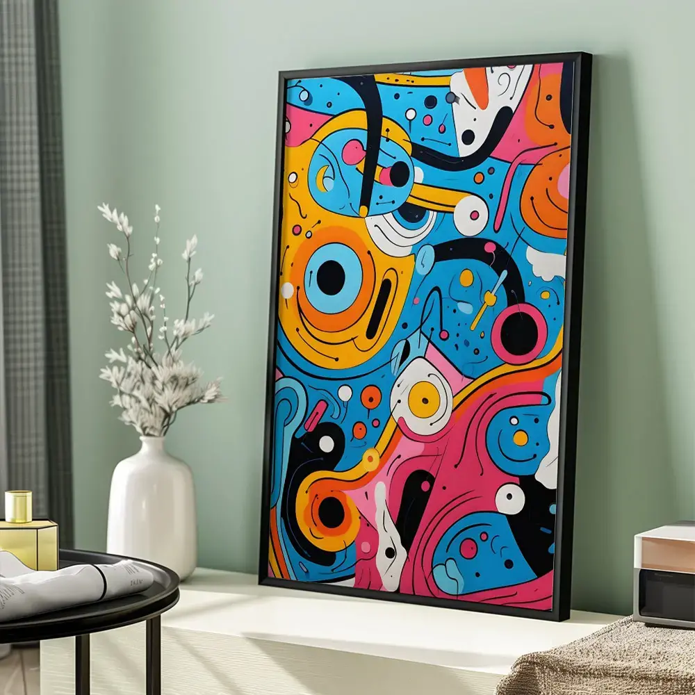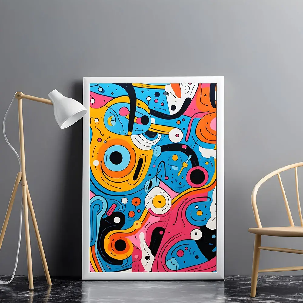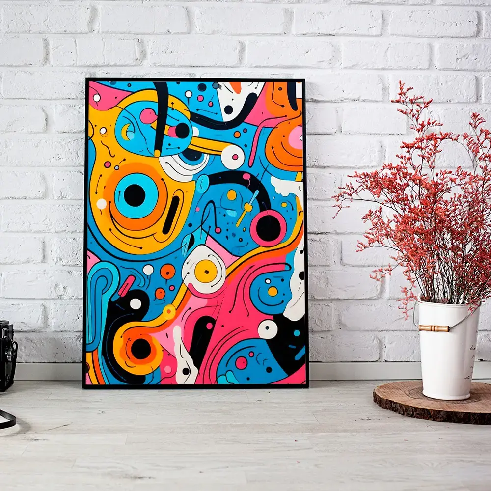 Un tablou abstract pop art emană energie și dinamism, atrăgând atenția printr-o explozie de forme și culori care se îmbină într-o armonie vizuală surprinzătoare.