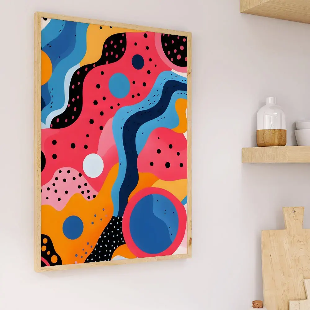 Un tablou abstract pop art emană energie și dinamism, atrăgând atenția printr-o explozie de forme și culori care se îmbină într-o armonie vizuală surprinzătoare.